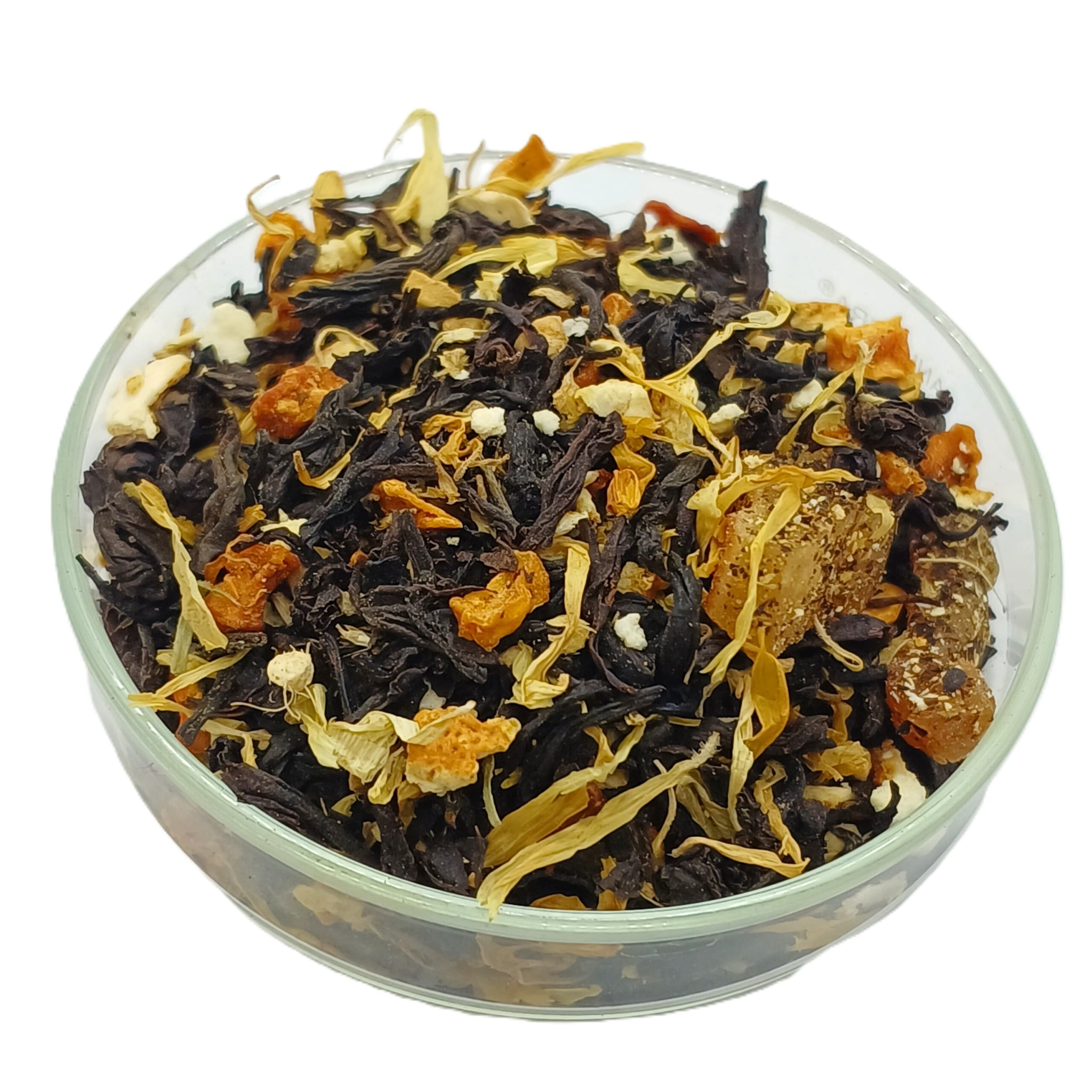 Składniki: Herbata czarna Assam FOB, dynia suszona, gruszka suszona, skórka pomarańczy, imbir suszony krojony, płatki nagietka, aromaty