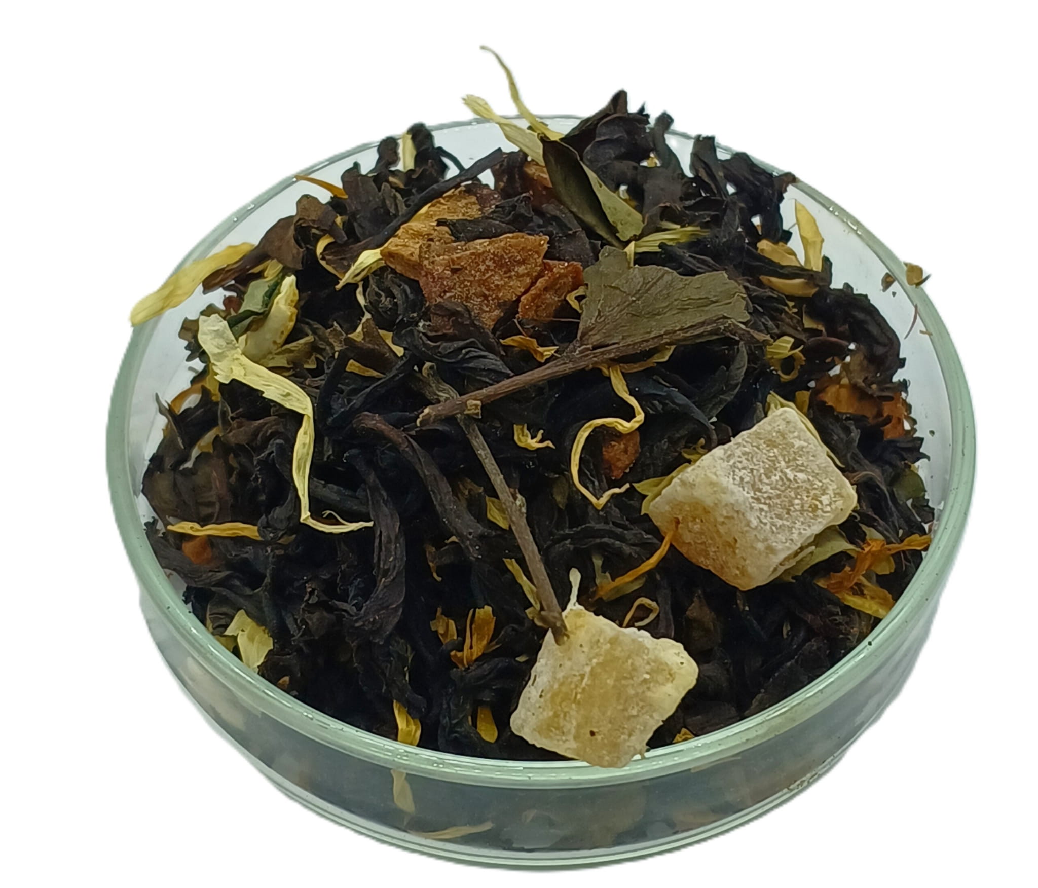 Składniki: herbata czarna Assam, płatki suszonej gruszki, kostki imbiru kandyzowanego, herbata biała Pai Mu Tan, skórka cytryny, aromaty, płatki nagietka, ziarna kardamonu